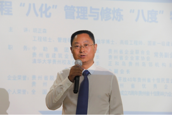 胡正森博士讲座的题目为《工程“八化管理”与修炼“八度”特质》,胡博士一直以来从事建设项目开发、工程项目管理工作,同时也对中国传统文化颇有研究。他经过多年的努力,积累了丰富的工程管理实践经验,首先他从工程管理的八化管理(目标化、标准化、方案化、制度化、流程化、信息化、模式化、常态化)对项目管理进行了深度剖析,同时结合中国传统的儒释道文化对员工应该修炼的八度特质(高度、纯度、深度、强度、尺度、力度、速度、长度)进行了生动阐释。在讲座过程中,胡博士多次提到工程人的初心和使命,激励员工们要胸怀祖国、胸怀社会、脚踏实地、向下扎根、向上生长、厚积薄发。