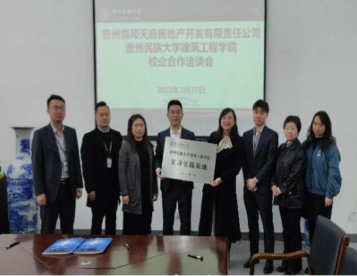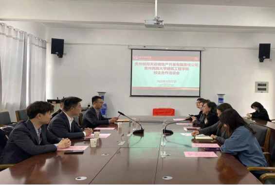 为进一步落实2023届高校毕业生春季促就业攻坚行动,加强校企战略合作,深化产教融合发展, 3月27日上午,谈球吧官方网站与贵州恒邦天府房地产开发有限责任公司校企合作洽谈会在建工公司A504会议室顺利举行。四川恒邦天府集团贵州区总经理范紫微、营销中心总经理鲁赟、人力资源部部长叶嘉文、行政部部长刘峰瑜,建筑工程公司党委书记何璘、建筑与规划系主任舒净、系副主任陈玫、办公室负责人余进江出席会议,会议由公司党委副书记陆忠婷主持。