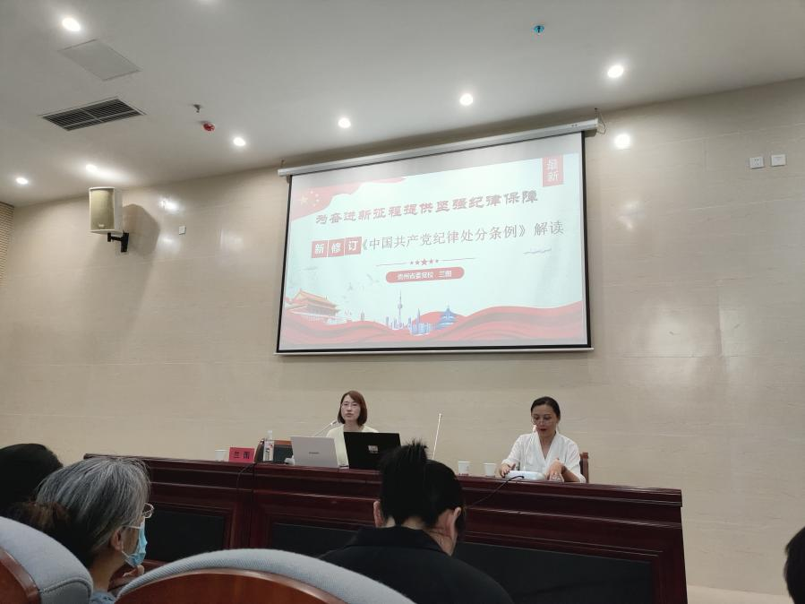 为扎实推进党纪学习教育走深走实,进一步提升党员遵纪守法、廉洁自律意识、纪律意识和规矩意识,7月10日下午,贵州省委党校兰图教授在谈球吧南校区行政楼第一报告厅开展题为《为奋进新征程提供坚强纪律保障》的专题辅导报告。报告会由建筑工程公司党委书记何璘主持,谈球吧官方网站、传媒公司、材料公司全体党员师生参加学习。