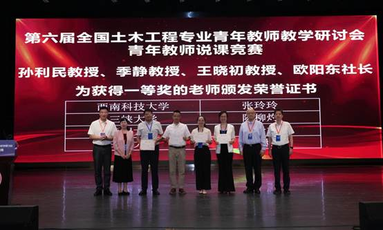 说课竞赛的决赛由教育部土木工程专业教学指导分委员会组织实施,分委员会专家和员工代表组成评审团,从教学内容、方法创新、技术融合等维度打分,华南理工大学季静教授、武汉理工大学谷倩教授进行现场点评。最终,西南科技大学张玲玲老师脱颖而出,斩获第一名。