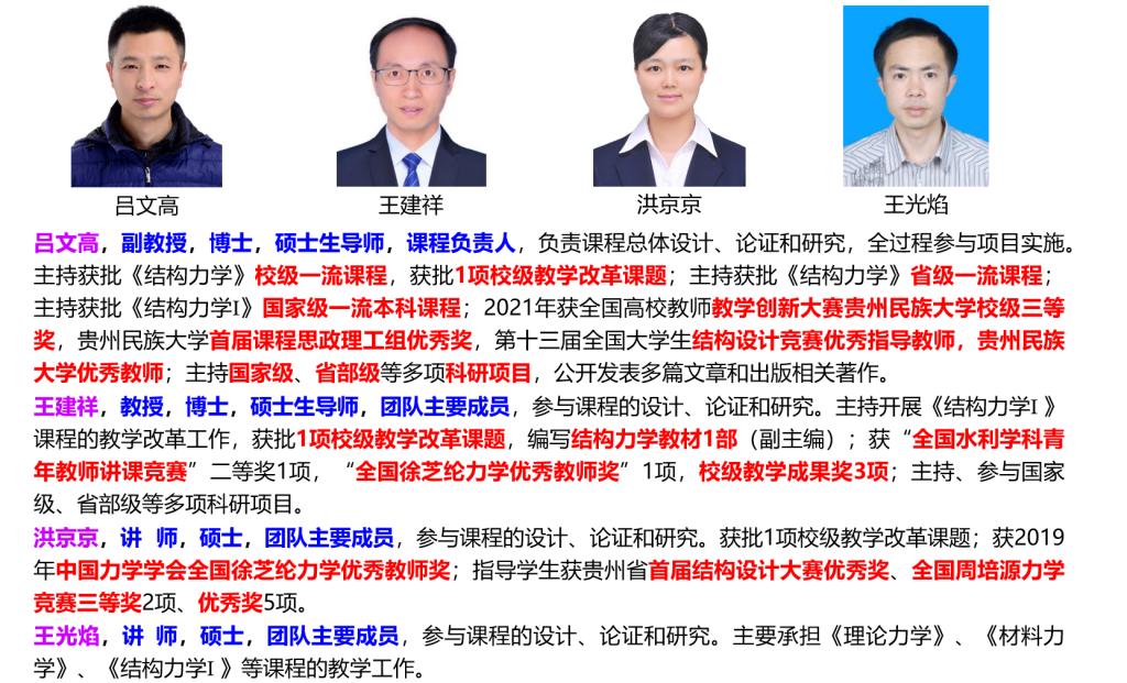 1、吕文高:副教授,博士,负责本课程的设计、论证和研究。承担本科生《土木工程概论》、《结构力学Ⅰ》、《结构力学Ⅱ》及研究生《结构动力学》、《有限单元法》等课程的教学工作,获第十三届全国老员工结构设计竞赛优秀指导教师(图2)。