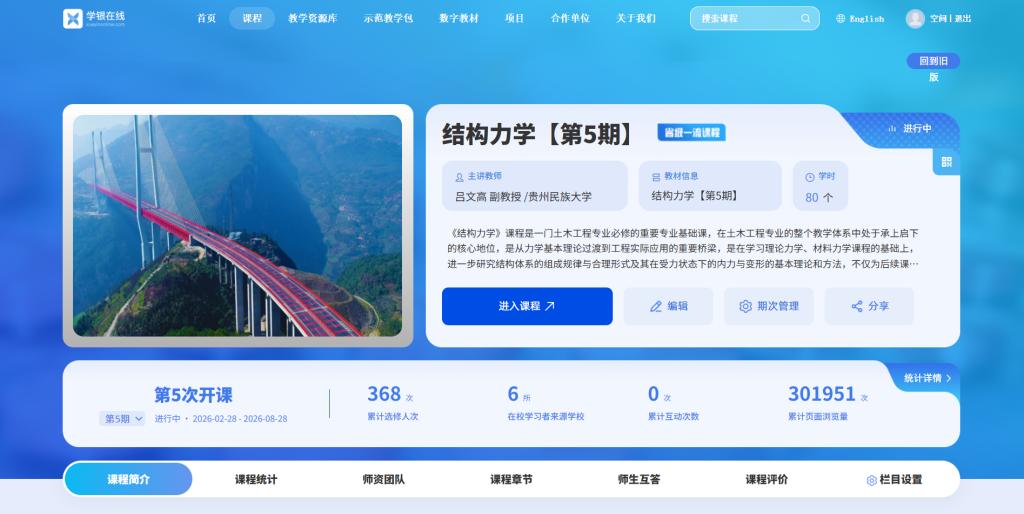 (1)《结构力学Ⅰ》是土木工程专业的必修及核心课程,系统讲授平面杆系结构的基本概念、组成规律及计算理论与方法,是后续其他课程学习的基础。结构力学课程开设于2007年,2019年至今由吕文高任主讲教师,任教以来一直进行课程教学改革的探索与实践。2020年该课程获批校级一流混合式课程,开始完善线下结构力学课程的相关资源,如课程简介、教材与参考教材、课程标准、教学大纲、教学教案、PPT课件、题库建设、课程考核体系等,同时也为下一步线上课程建设提供大量资料。2022年该课程获批省级一流线上课程,建设内容主要包括知识点模块化、知识点脚本完善、高质量教学视频、随堂测验、随堂讨论、单元测验、单元作业及工程案例等非视频资源。经过三年的课程运营与持续建设,该课程于2025年获批国家级一流本科课程(线上线下混合式一流课程)。目前,《结构力学》省级一流线上课程已运营到第5期(图1),同时以线上线下混合式开展教学活动。
